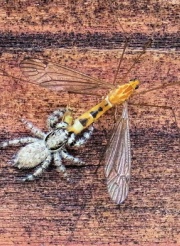 シラヒゲハエトリ、ガガンボを捕らえる
